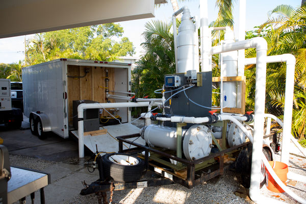 The bizarre-looking contraption is a maze of PVC pipes and tanks. Red tide infected water is sucked up into the system and uses ozone to oxidize and destroy the re tide organism, Karenia brevis, before returning the water back to the body it came from.