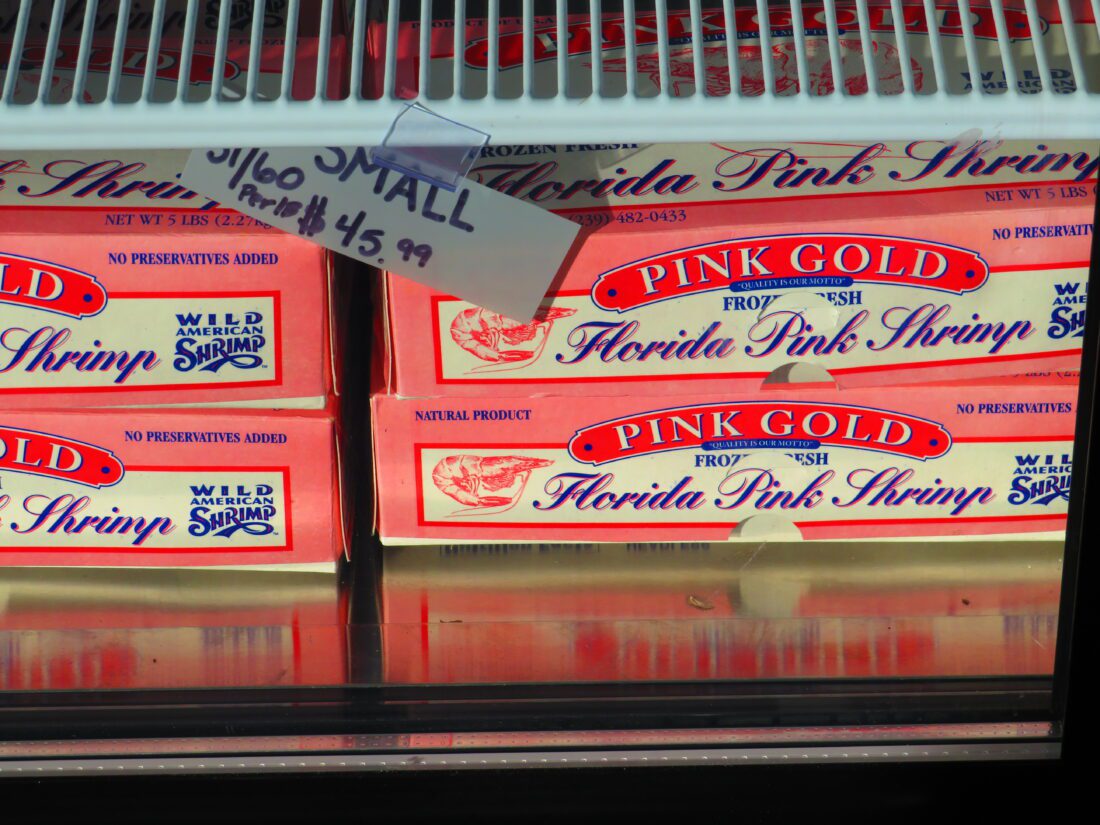 Just before the Matanzas Pass Bridge at the Fort Myers Beach Plaza located at 19051 San Carlos Boulevard are the catches from the Gala family’s newest shrimping boat “Big Daddy” and other local fishermen.