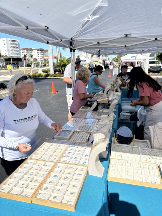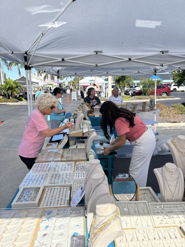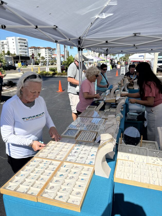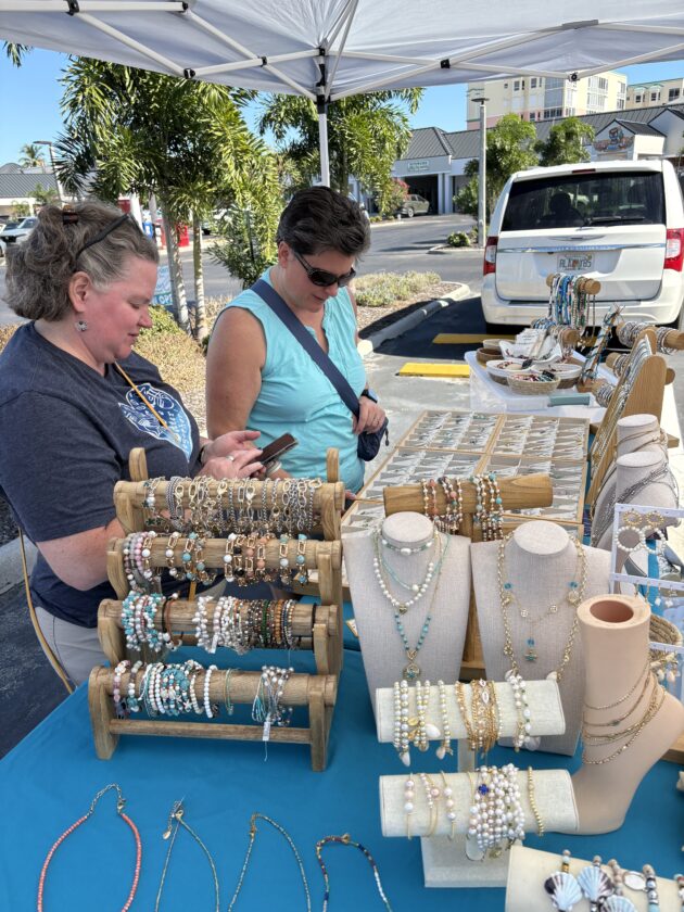 Maria Carlini, who owns Bonita Beach Jewelers, serves customers at her Island Jewel booth at the Santini Marina Plaza farmer's market. Photo by Nathan Mayberg