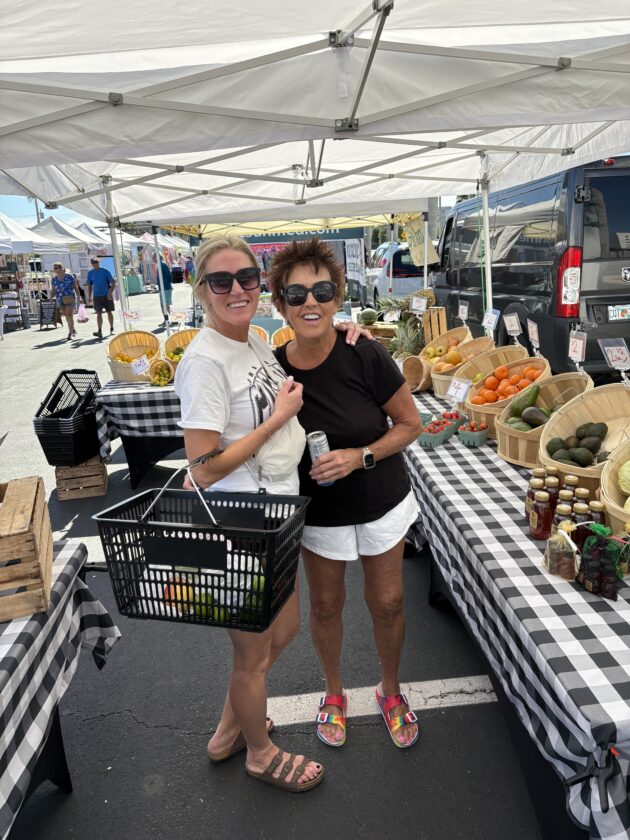 Tyra Peltier (left) and Diane Myrvold (right) of Minnesota, shop at the Santini Farmer's Market at Santini Marina Plaza on Fort Myers Beach. Photo by Nathan Mayberg