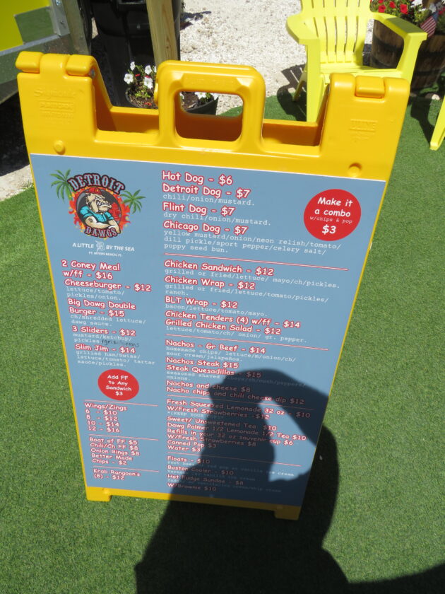 After Hurricane Ian, they began by periodically opening their hot dog business at the former vacant lots occupied by The Whale and Sandy Bottom’s. This year, they moved to their new location where they spend all day and into the night selling their hot dogs, burgers, wings, nachos, chicken wraps, floats and freshly-squeezed lemonade.