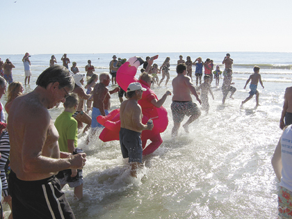 It was a festive atmosphere at the Outrigger Beach Resort Jan. 1 as a crowd of about 200 were on hand to observe or take part in the plunge into the water in the 15th annual tradition known as the Fort Myers Beach Polar Bear Dip.