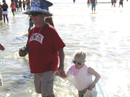 Don Imhoff of Wisconsin assisted his eight-year-old granddaughter Liliana Randl in and out of the water. Liliana’s mom Danielle said the weather was “better than what it would be in Wisconsin,” though Liliana said the water was “too cold.”