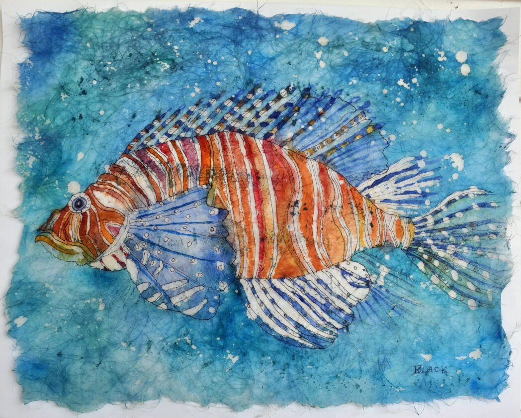 A ninth generation Floridian, Elyse Olney’s life has revolved around the ocean. At 18, she moved to the Florida Keys to become an offshore fisherman. After running a charter fishing boat one day, she decided to draw on the long bill, or sword, of a swordfish fish she had caught. Her ink and graphite work resembles scrimshaw.