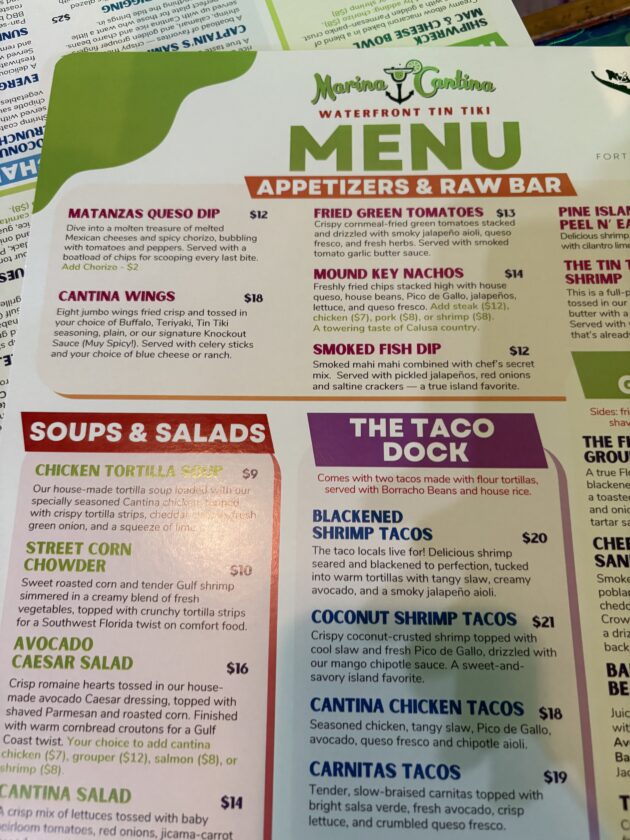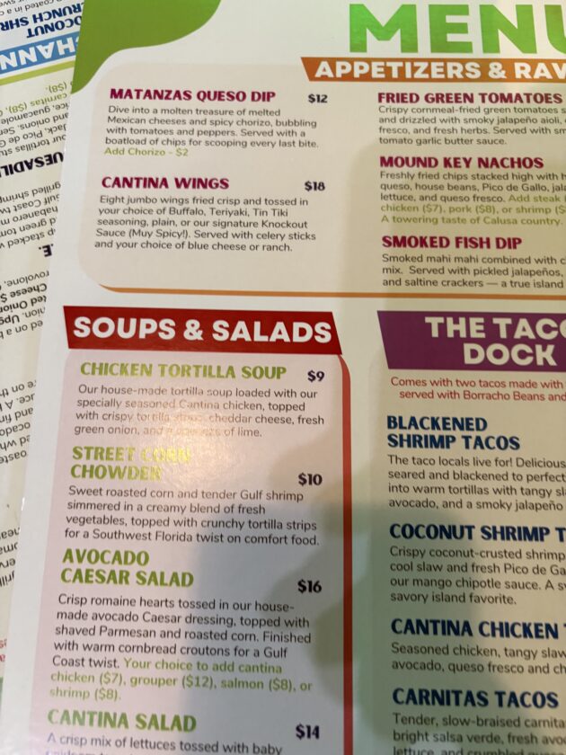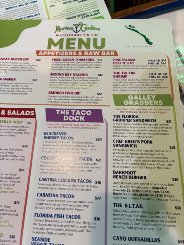 The taco menu features blackened shrimp tacos, coconut shrimp tacos, chicken tacos and veggie tacos.