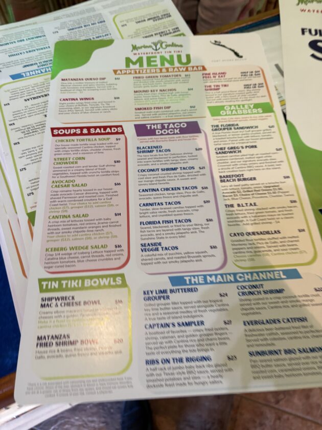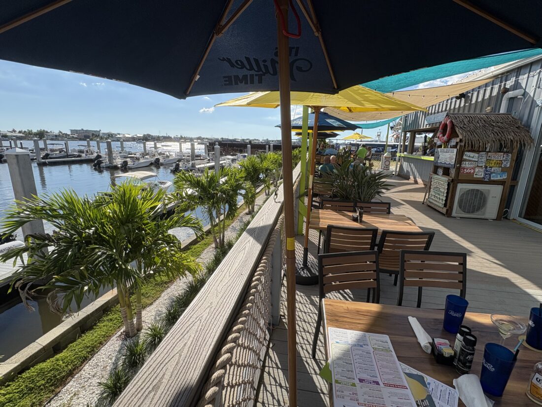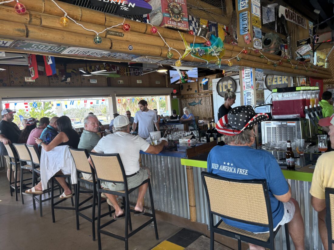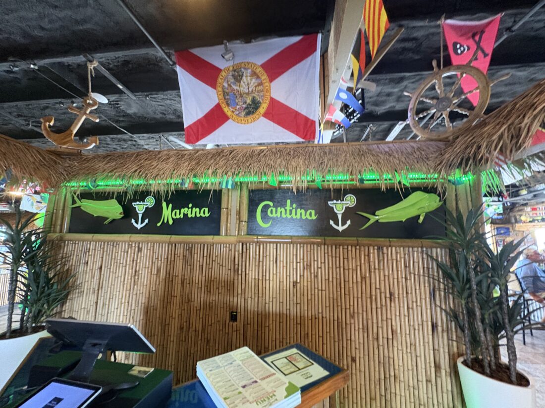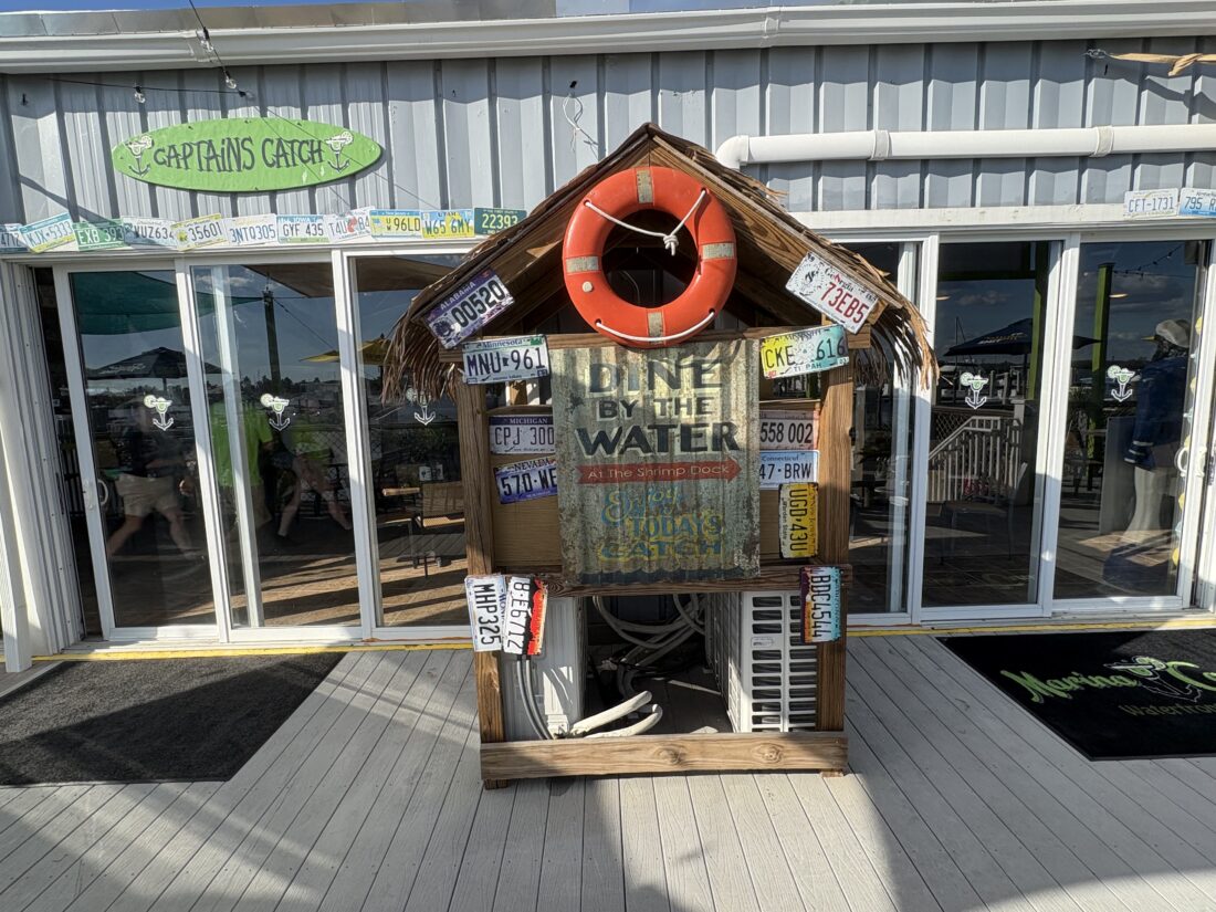 The current menu features the main dishes of key lime buttered grouper, coconut crunch shrimp, catfish, barbecue salmon, ribs and a “captains sampler” of fried oysters, grouper fingers, calamari and shrimp.