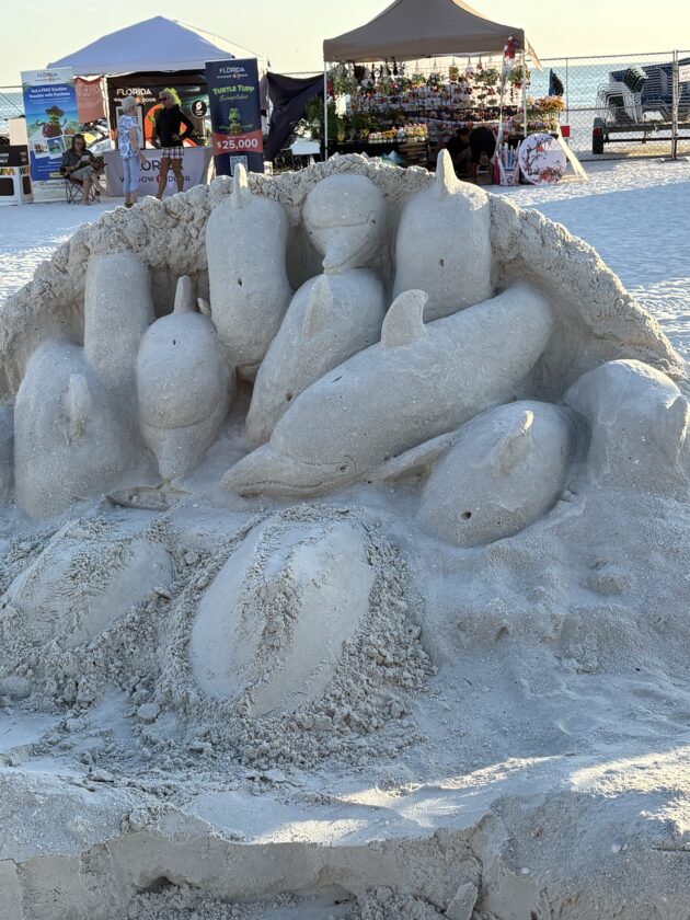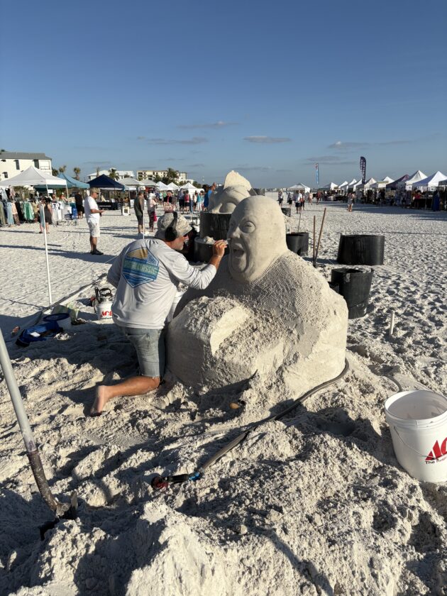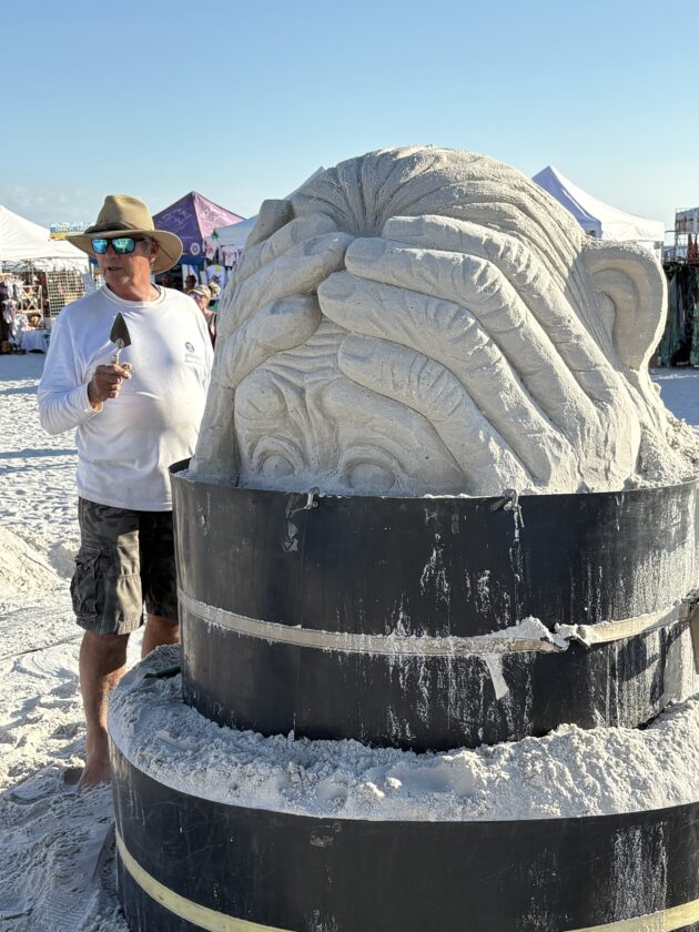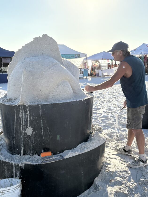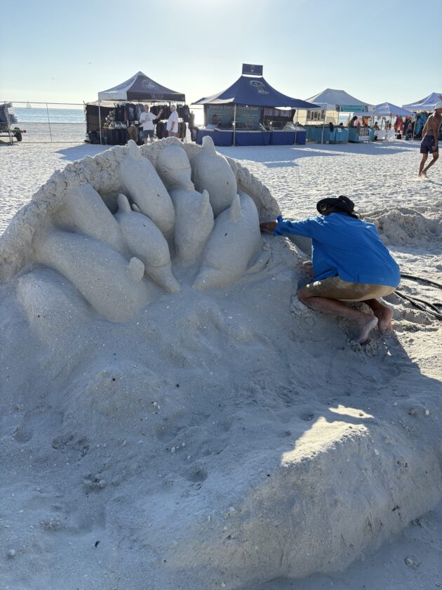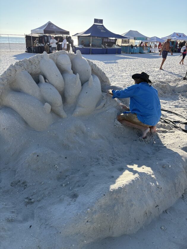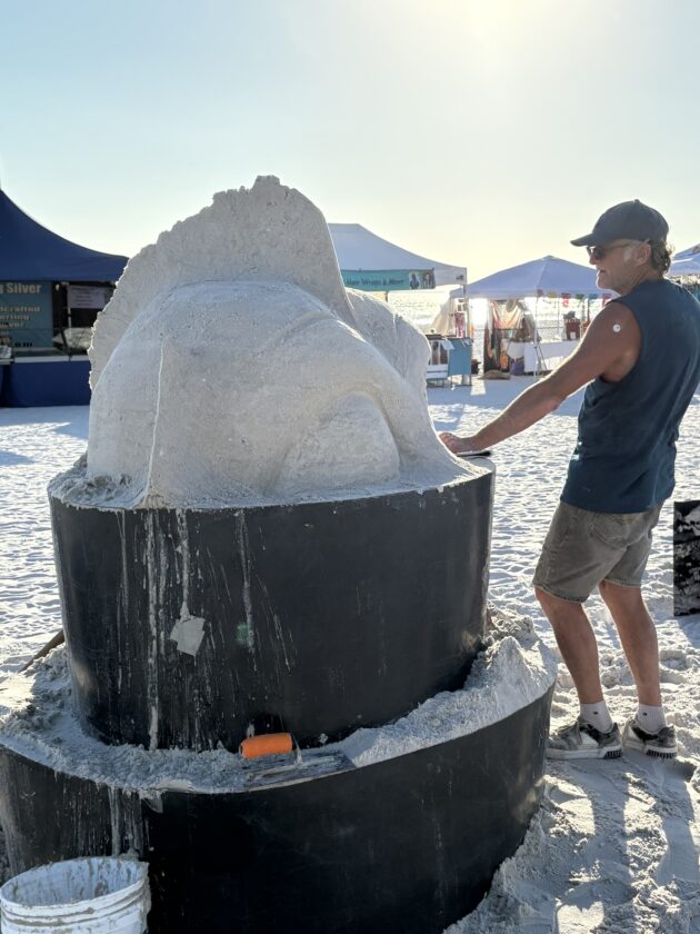 Paul Hoggard works on his sculpture of a group of bottlenose dolphins at the American Sand Sculpture Championship at the DiamondHead Beach Resort on Fort Myers Beach. Photo by Nathan Mayberg