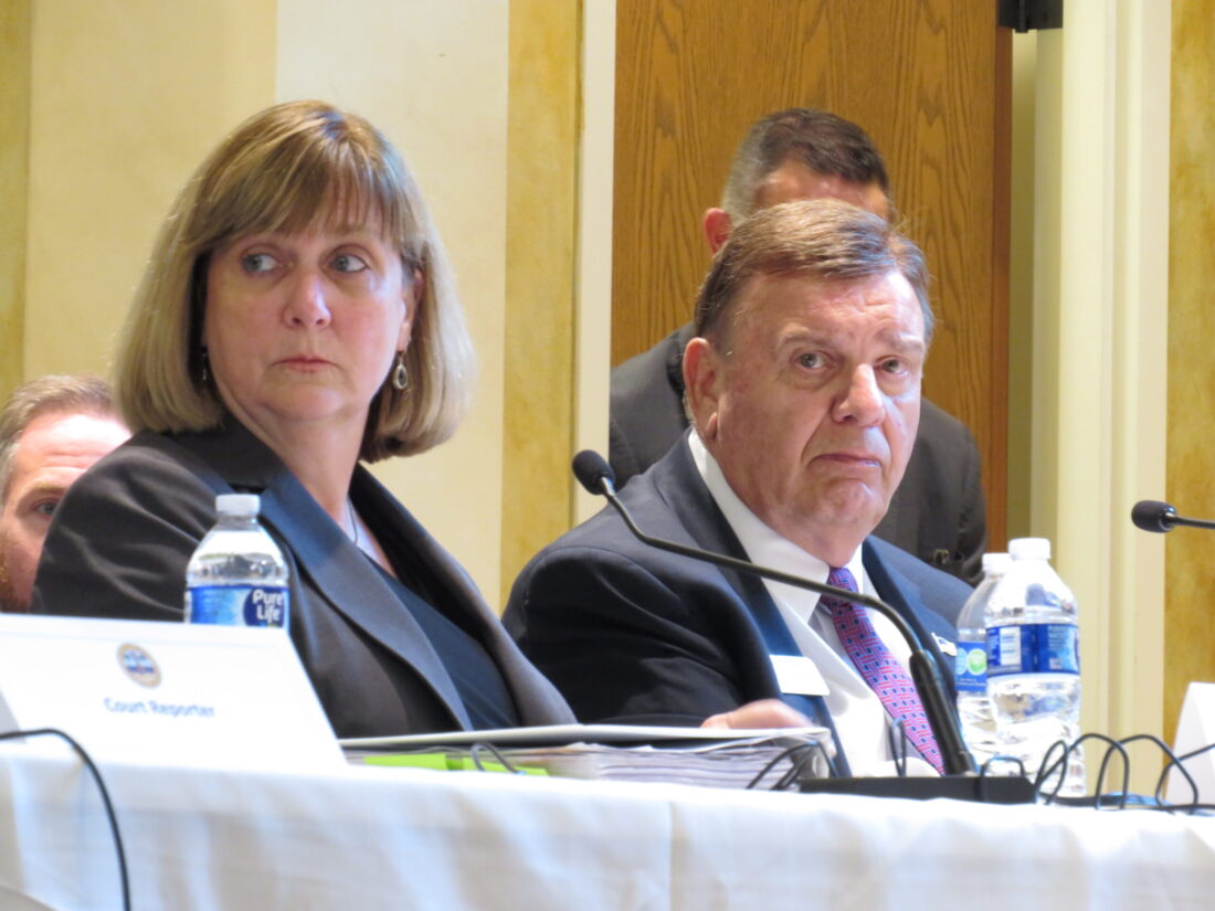 Fort Myers Beach Mayor Dan Allers (right) with Fort Myers Beach Attorney Becky Vose (left) during the Nov. 5 mediation hearing with the School District of Lee County. Photo by Nathan Mayberg