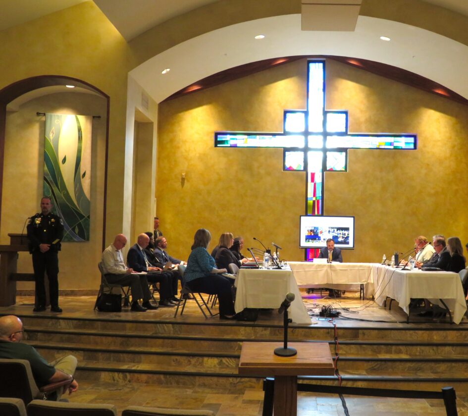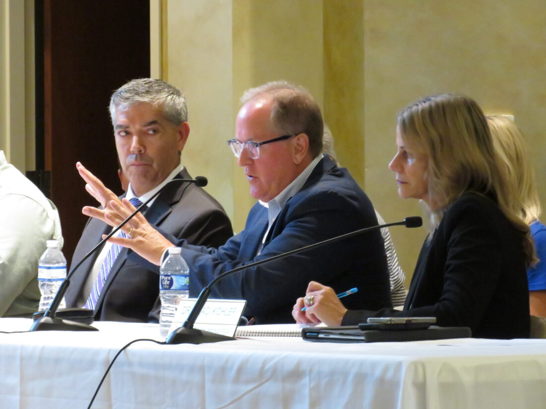 Fort Myers Beach Councilmember Jim Atterholt makes a point while addressing School District of Lee County officials at a mediation hearing at St. Leo the Great Catholic Church in Boniita Springs. At left is Town of Fort Myers Beach Manager. At right is Deputy Manager is Dr. Traci Kohler.