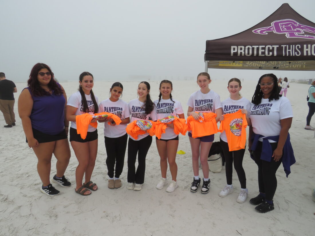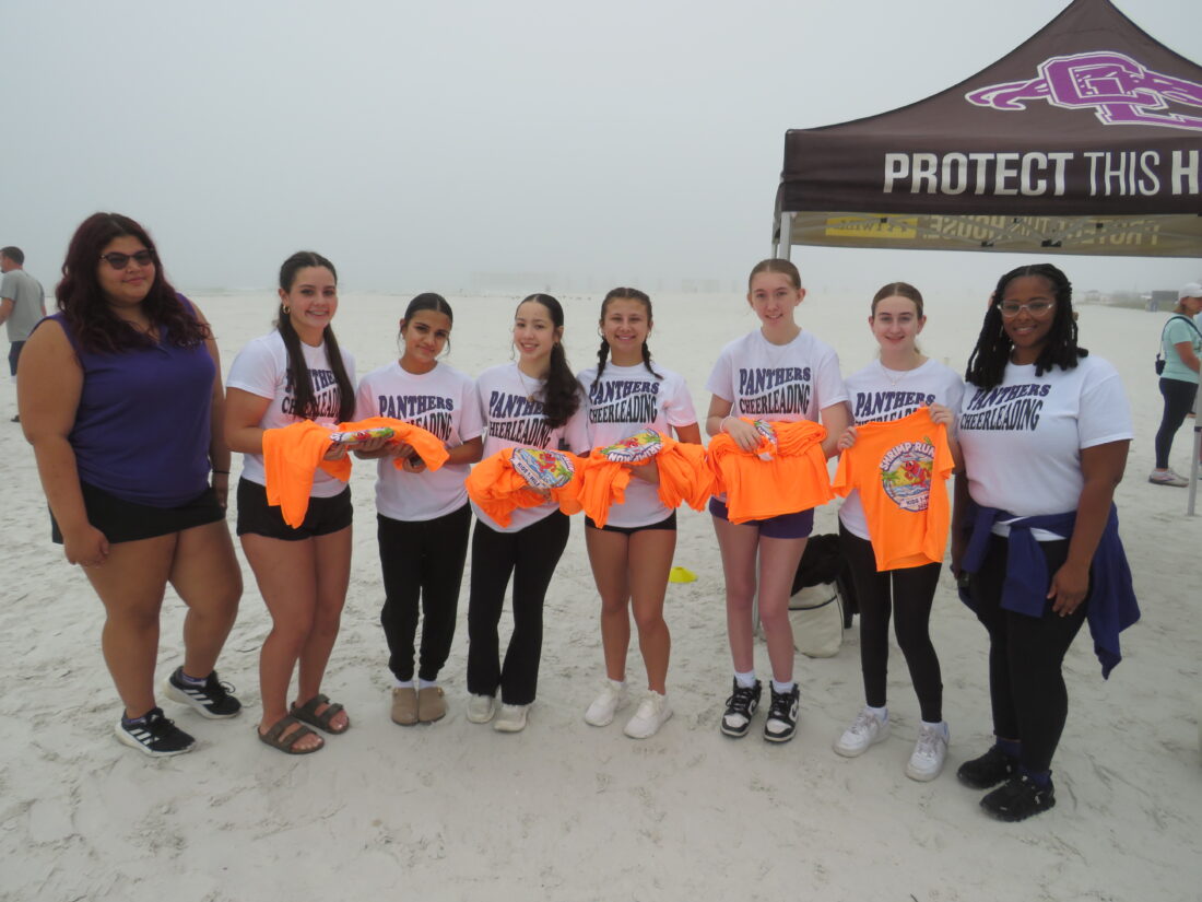 Cypress Lake High School cheerleaders cheered on the runners in the Fort Myers Beach Lions Club Kids Shrimp Run on Saturday. From left to right is Lia Vargas, Olivia Coey, Simone Torres, Olivia Kanady, Jaiden Kram, Chloe Fuwell, Amy Grochowski and Coach Sasha Johnson. Photo by Nathan Mayberg