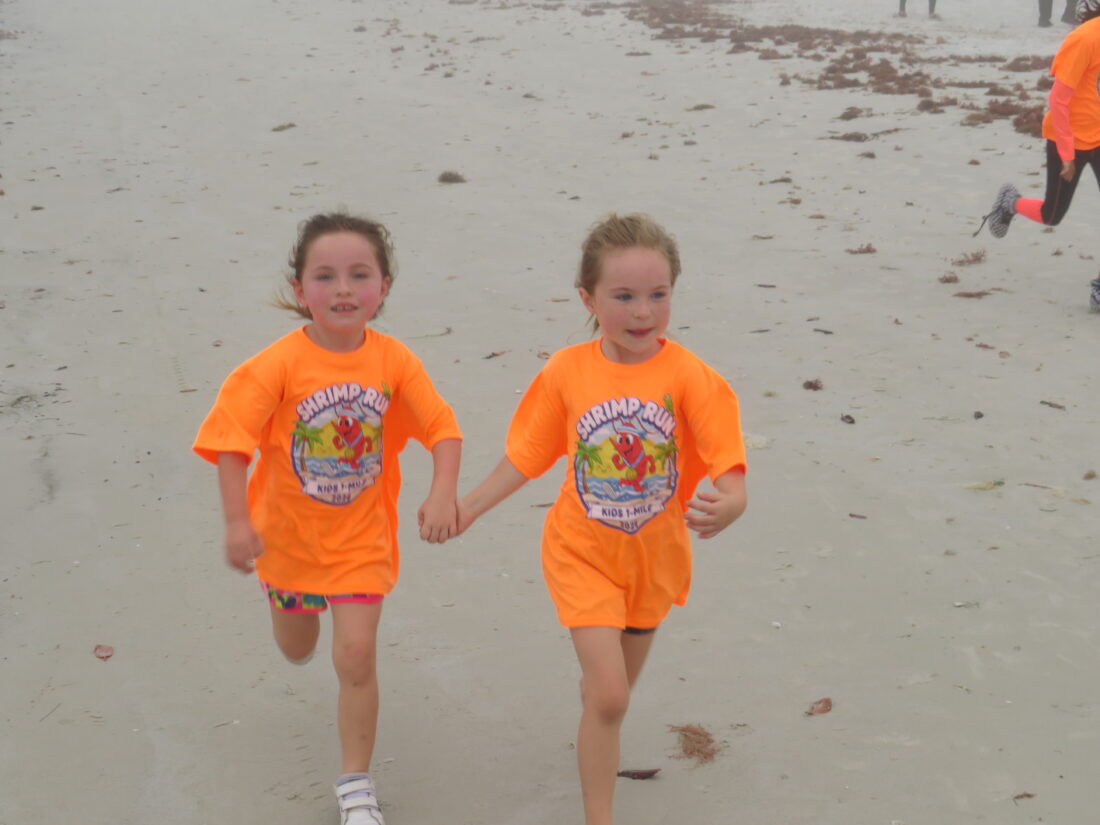 Adelynn McMillen and Emma McMillen hold hands as they race down to the finish line at the Fort Myers Beach Lions Club Kids Shrimp Run. Photo by Nathan Mayberg