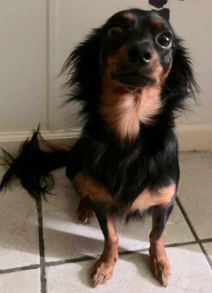She greets us after work with a dance on her hind legs and then a wiggle around the room. She begs us to come play by grabbing your hand or nudging you to get up. She loves her toys and to play fetch. She won’t return the toy but will play “Catch me if you can”.