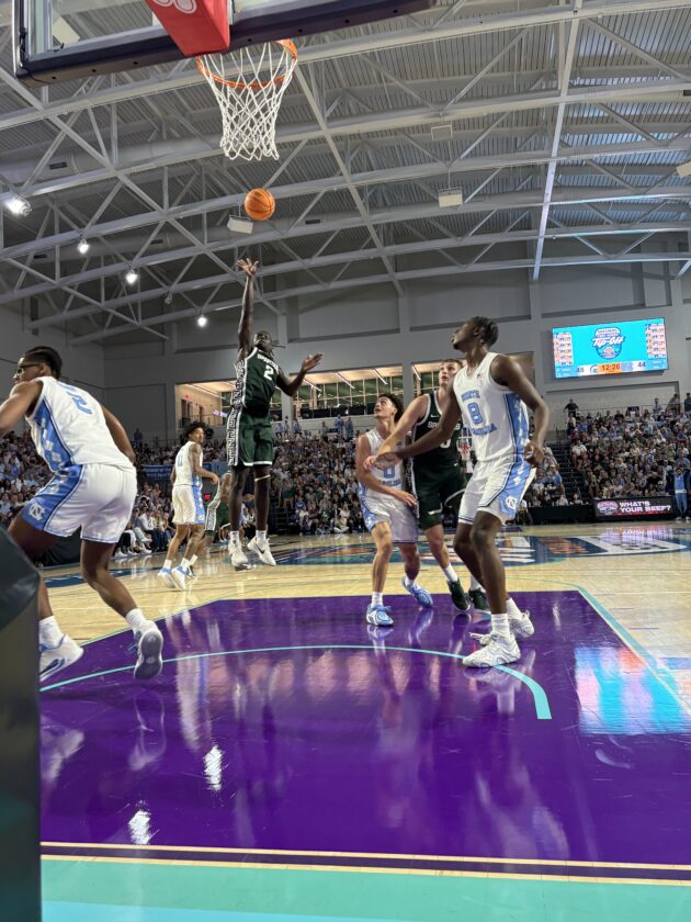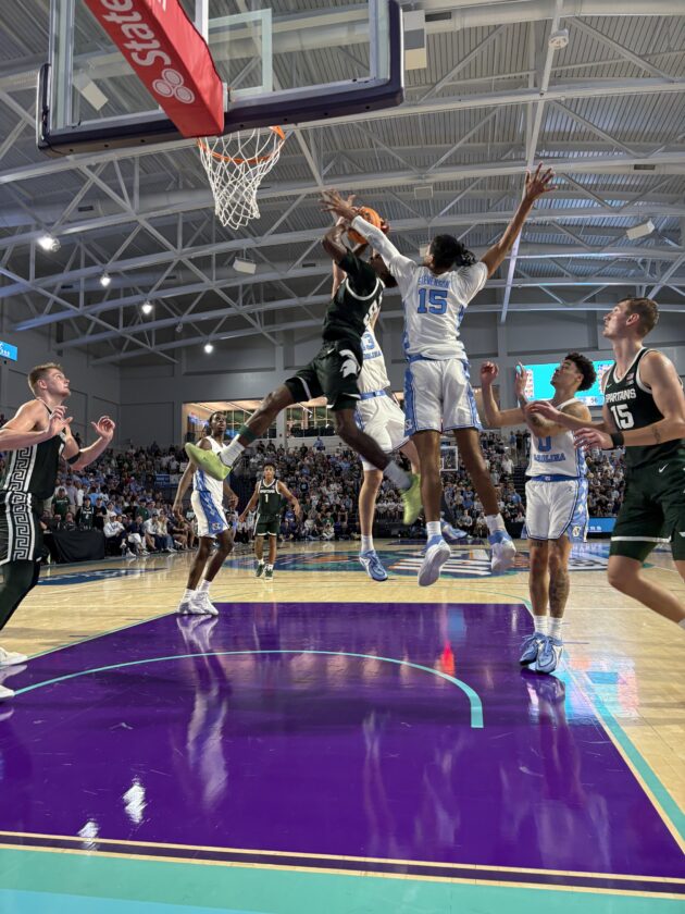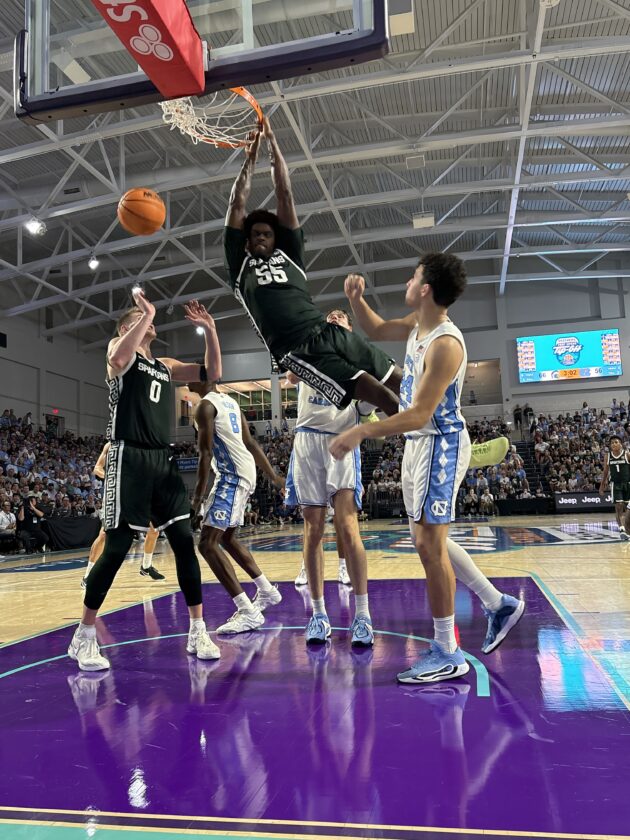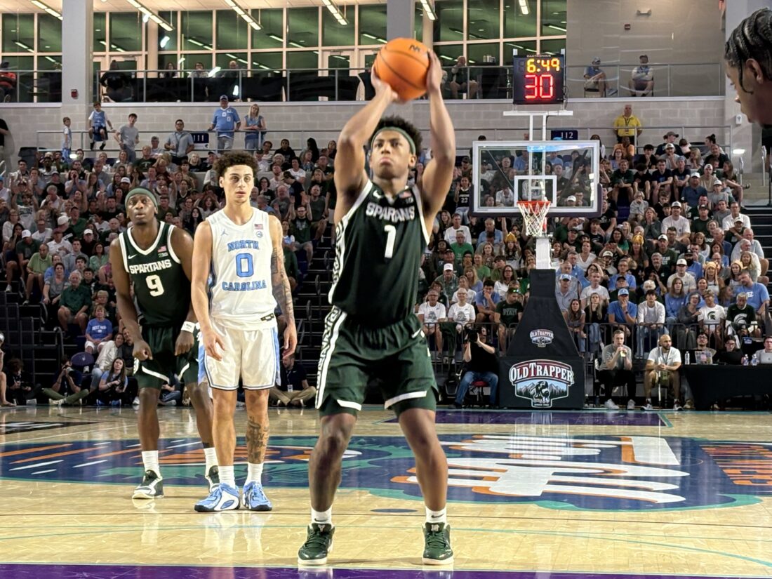 In the second half, Fears didn’t miss. He hit all five of his shots including a crucial three-pointer after North Carolina doubled up on Jaxon Kohler. Kohler dished the ball back out to Fears, who connected on the three-point shot while being fouled, which extended the lead to eight points. The lead would only grow from there. The 6’2 guard showed his heart was as tall as North Carolina’s 7-foot center Henri Veesaar as he leaped to the hoop while challenged in the air by the towering Estonian. Fears scored eight of Michigan State’s final 10 points. His Thanksgiving show, in which he went 8-for-10 from the field, also included five rebounds.